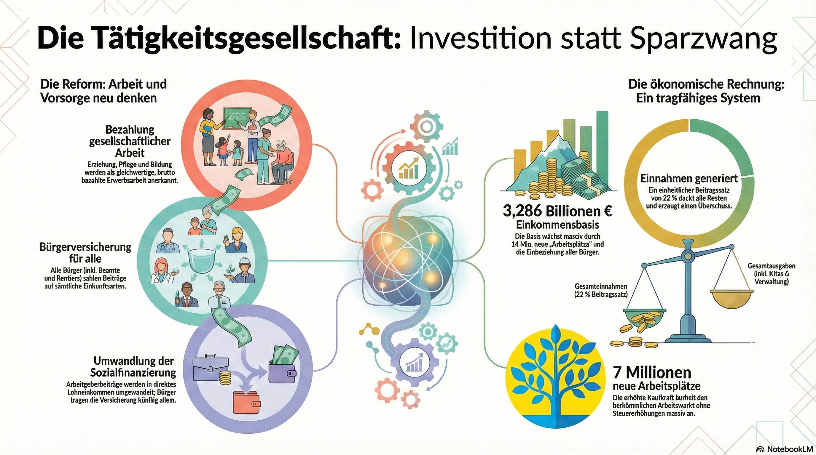 Die mathematische Logik zeigt: Ein moderner Sozialstaat muss kein Sanierungsfall sein. Wenn wir den Mut aufbringen, Arbeit neu zu definieren und die Finanzierung auf alle Schultern zu verteilen, wird aus dem Schuldenparadoxon ein tragfähiges Fundament für den gesellschaftlichen Wohlstand von morgen.