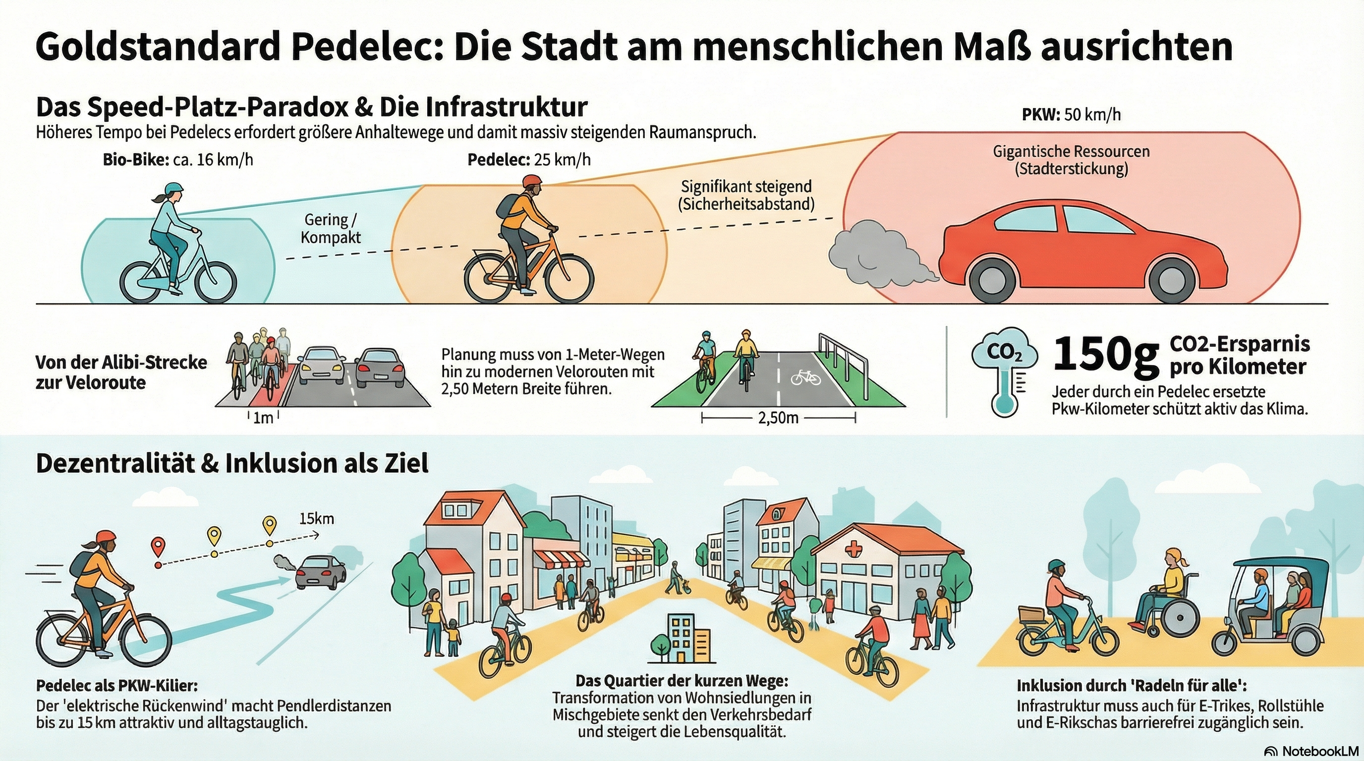 Der Markt hat dies längst erkannt: 2023 wurden erstmals mehr Pedelecs als klassische Fahrräder verkauft. Doch Vorsicht: Ein reiner Antriebswechsel reicht nicht aus, wenn wir die alten, zentralisierten Stadtstrukturen beibehalten. Verkehrswende braucht eine neue soziale Logik.