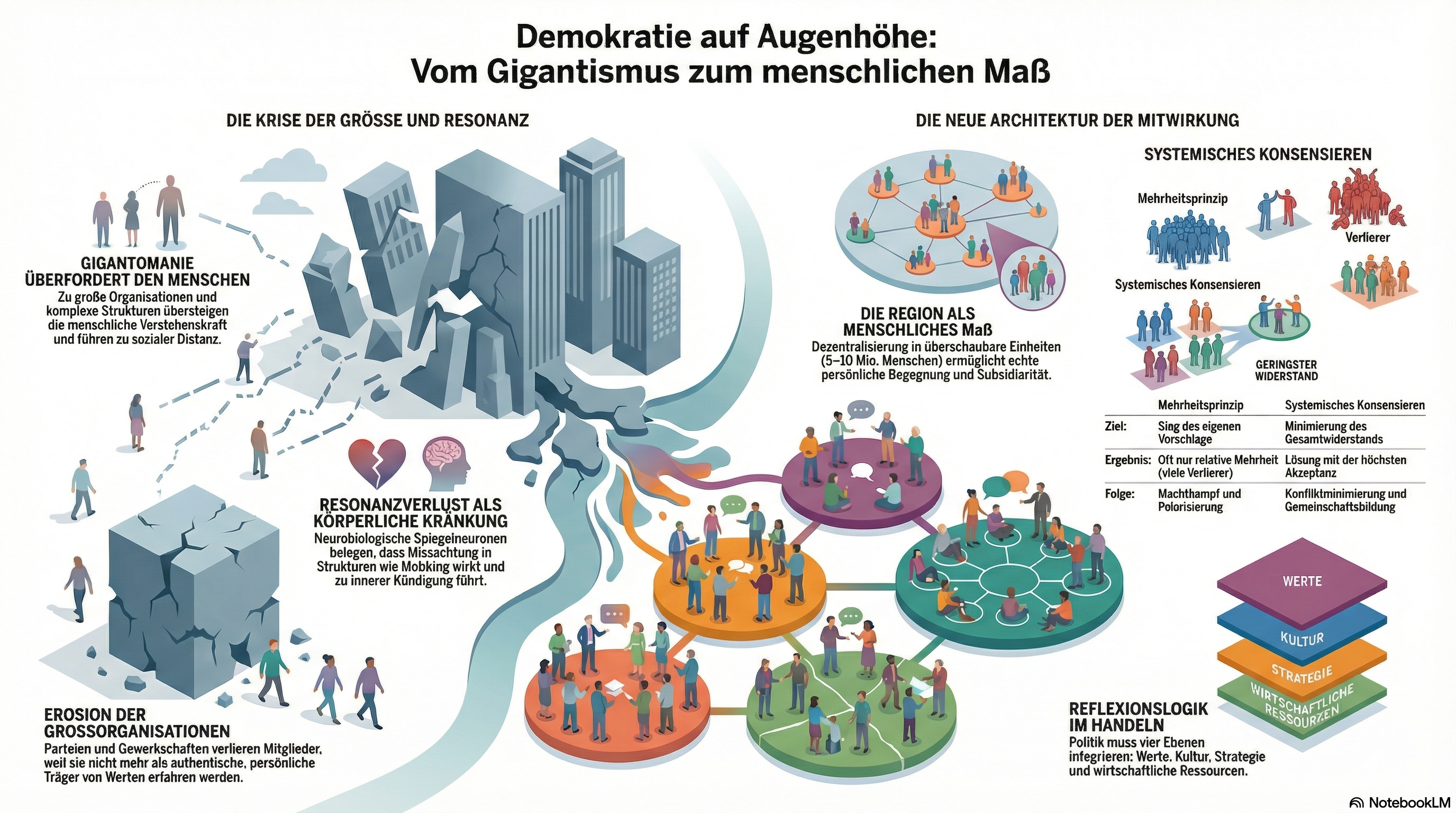 Kernerkenntnisse zur Selbstermächtigung der Bürger in der StadtentwicklungDieses Briefing fasst die zentralen Thesen meiner Masterarbeit aus dem Jahr 2025 „Selbstermächtigung der Bürger als Konstitutive demokratischer Stadt- und Regionalentwicklung“ / „Citizen Empowerment as a Constitutive Element of Democratic Urban and Regional Development“ zur Neuausrichtung der Bürgerbeteiligung in der Stadt- und Regionalentwicklung zusammen. Der Kern meiner Argumentation ist die Forderung, die Mitwirkung der Bürger nicht länger als ein politisch „zu gewährendes Recht“, sondern als ein fundamental „zu gewährleistendes Recht“ zu etablieren. Einen Lösungsansatz sehe ich in der „Reflexionslogik“, ein strukturierendes Prinzip, das komplexe gesellschaftliche Entscheidungsprozesse hierarchisch ordnet und sicherstellt, dass ethische Grundwerte den Rahmen für Kultur, Politik und schließlich die Wirtschaft vorgeben. Dies bietet eine tragfähige Statik, um der Selbstermächtigung der Bürger Gestaltungsmacht zu verleihen und sie gegen antidemokratische Kräfte zu verteidigen. |