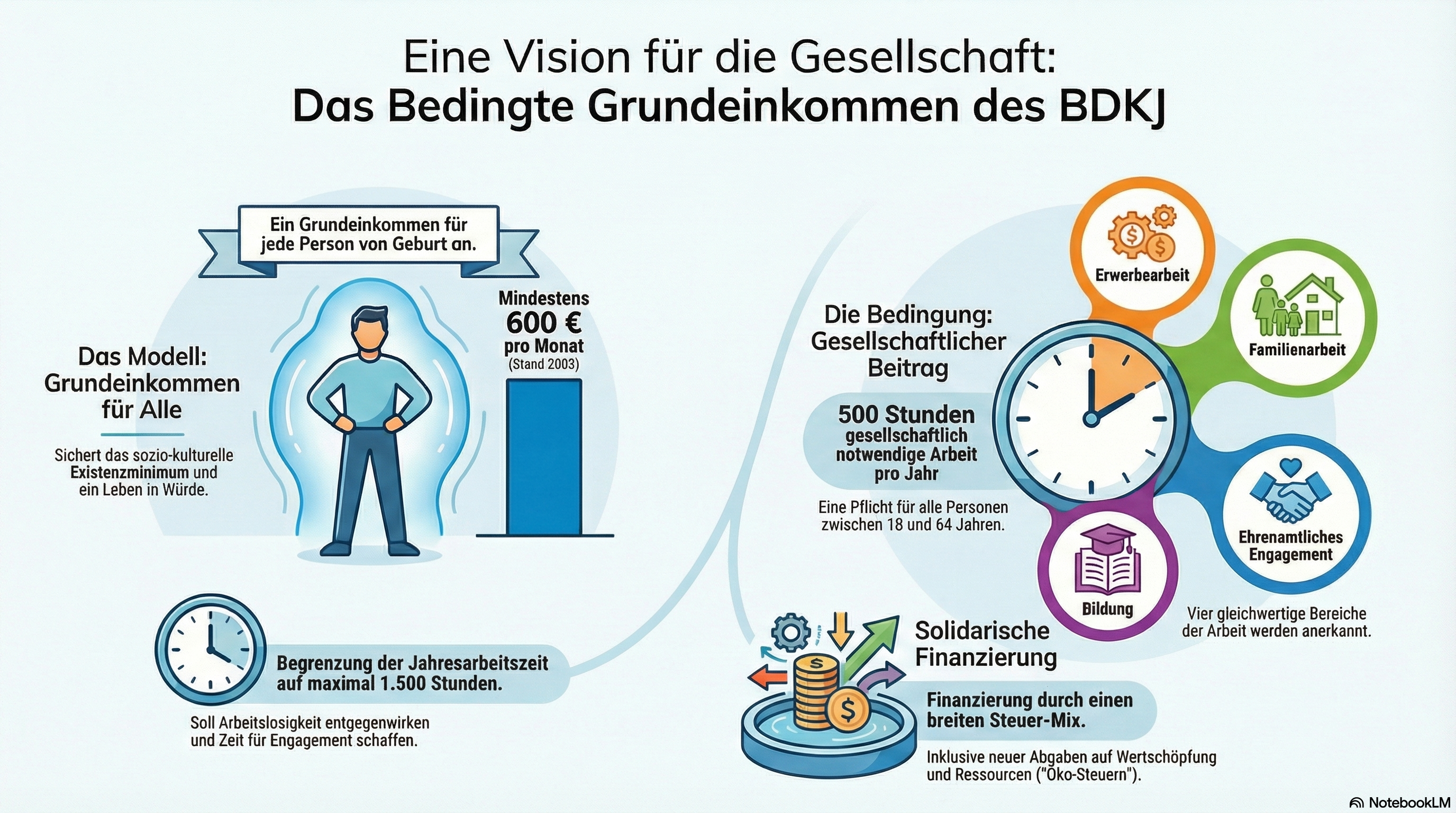 Mehr arbeiten, damit (wessen?) Wohlstand wächst?Während Wirtschafts-Ideologen über „Life-Style-Arbeitsverträge“ palavern, haben sozialbewußte Nationalökonomen längst die notwendige Umwandlung der Erwerbsarbeits-Gesellschaft in eine Tätigkeits-Gesellschaft erkannt und berechnet.Bereits im Jahr 2003 legte der Bund der Deutschen Katholischen Jugend (BDKJ) ein Konzept vor, wie eine gerechtere Gesellschaft, zentriert auf ein tätigkeitsbasiertes Grundeinkommen, die Armutsrisiken mindern kann. Dieses Modell sieht ein bedingungtes Grundeinkommen in gleicher Höhe für Kinder und Erwachsene vor, w elchesdas sozio-kulturelle Existenzminimum absichert. Der Anspruch auf dieses Einkommen basiert auf der Erbringung von jährlich mindestens 500 Stunden gesellschaftlich notwendiger Arbeit in vier gleichwertigen Bereichen: Erwerbsarbeit, ehrenamtliches Engagement, Familienarbeit und Bildung. Finanziert werden soll das System hauptsächlich durch eine reformierte Steuerstruktur, einschließlich einer negativen Einkommenssteuer und einer Ressourcenverbrauch-Steuer, und wird ergänzt durch Maßnahmen wie eine Höchstarbeitszeitbegrenzung und eine stärkere Investition in Bildung. |